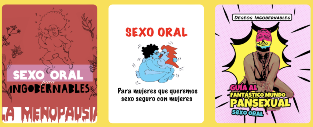 En el web site encontrarás: Nuestras 3 guías de Sexo Oral, “Guía para mujeres que queremos sexo seguro con mujeres”, “Guía al fantástico mundo pansexual”, “La menopausia: Sexo oral para ingobernables!”. El hermoso “Oráculo del Deseo”, con 12 mensajes creados por seres que fluimos por el deseo, encontrando en ello una práctica transfeminista que politiza el goce, afirma el consentimiento, expande los cuidados sexuales. “Las 9 claves para una plenopausia ingobernable” y más!!